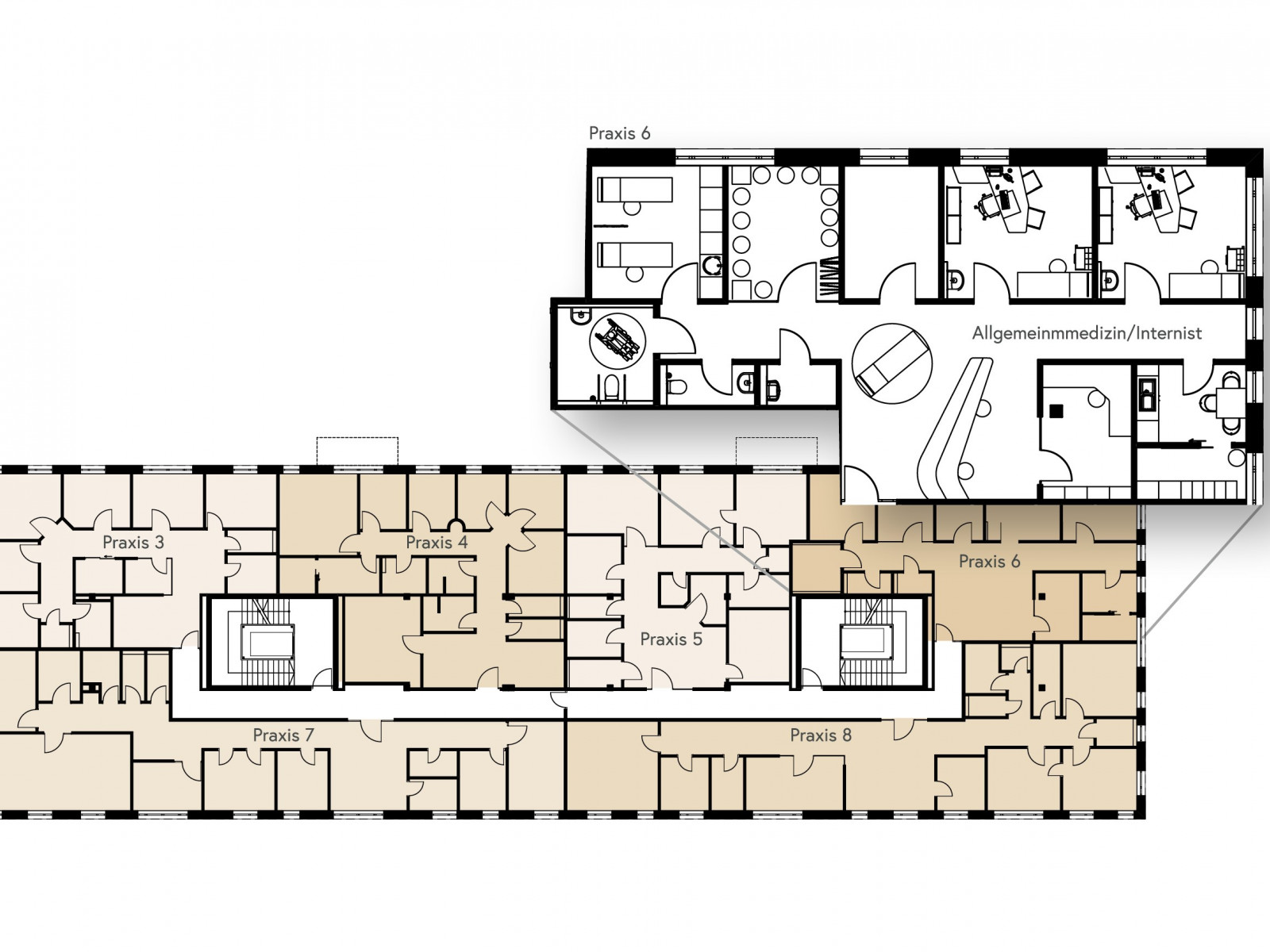 Neubau eines Ärztehauses im Münchener Süden mit modernen, hellen und flexiblen Praxisflächen für Fachärzte verschiedener Fachrichtungen und ergänzendem therapeutischen Angebot.